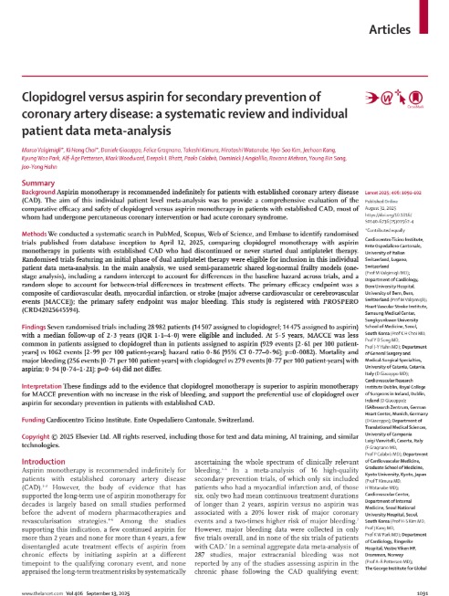 Clopidogrel versus aspirin for secondary prevention of coronary artery disease LANCET 2025