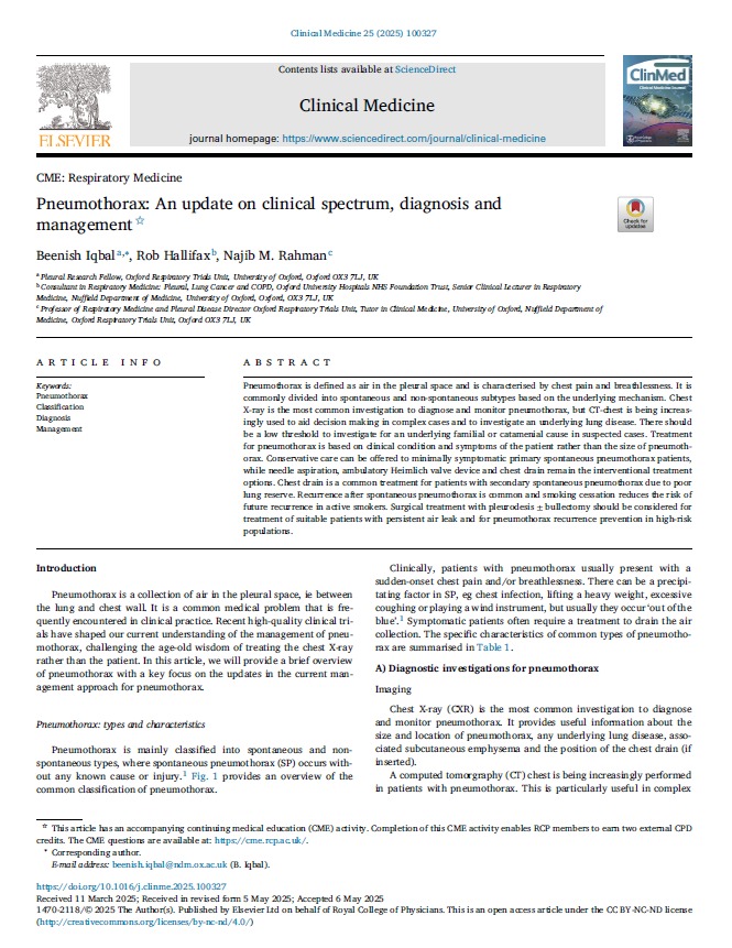 Pneumothorax: An update on clinical spectrum, diagnosis and management Clinical Medicine 2025