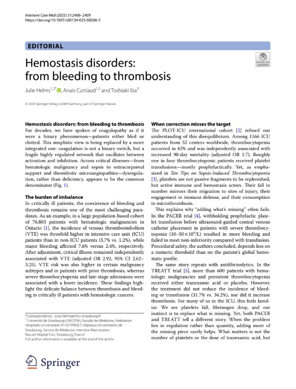 Hemostasis disorders from bleeding to thrombosis Intensive Care Med 2025
